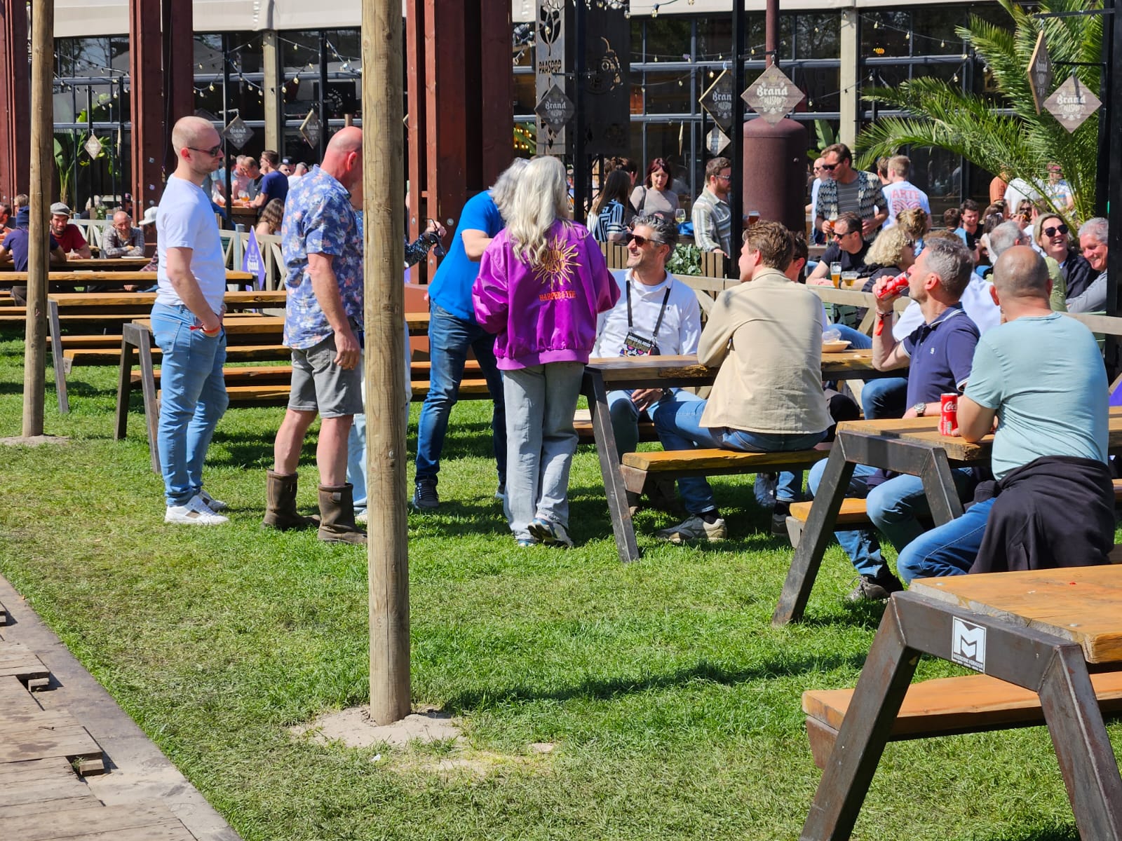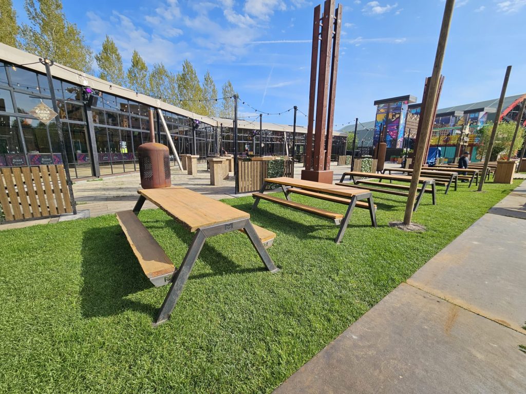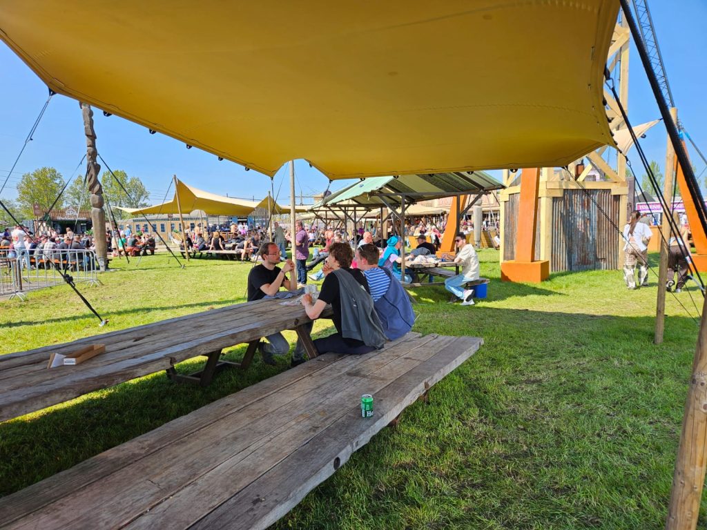 Op het festivalterrein plaatsten we een mix van lage en hoge event tables. De lage tafels stonden verspreid over foodpleinen en rustplekken, ideaal om even bij te komen. De hoge tafels boden bezoekers de mogelijkheid om staand te eten of gezellig even rustig te praten. Zo ontstond een gevarieerd en uitnodigend terrein dat volledig aansloot bij de sfeer van Paaspop.
