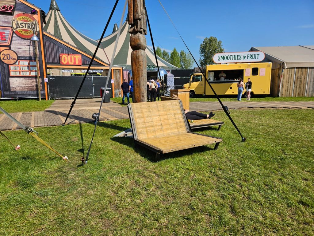 Op het campingterrein zorgden we voor een relaxte en praktische setting. We leverden comfortabele loungebanken voor ultieme ontspanning, gezellige rondzits om samen te komen, en stevige draglines waar je rustig op kunt zitten of eten.